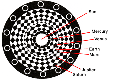 d. On both, the pattern of the astronomical model and that of the pavement, six orbits are counted up to the planet Saturn respectively, plus the sun, which remains motionless in its place, as the seventh celestial body.