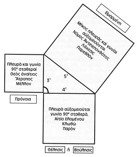 Ο Πυθαγόρας δέχεται δύο παραμέτρους εις τας ανθρωπίνους πράξεις: την ενδυνάμωσιν της ελευθερίας της βουλήσεως, Κλωθώ/παρόν και την αναγκαιότητα της Ειμαρμένης, Λάχεσις/παρελθόν. Και αι δύο ευρίσκονται υπό την εξουσίαν της Προνοίας, της καθέτου πλευράς, που εκπροσωπεί την συνολικήν μελλοντικήν εξέλιξιν των όντων και έχει πάντοτε το ίδιο μήκος, διότι δεν είναι δυνατόν το κάθε έλλογον ον κεχωρισμένως να δύναται να μεταβάλλη με την θέλησίν του την συνολικήν πορείαν της Φύσεως. Η πρώτη παράμετρος εξαρτάται από το αυτεξούσιον του ανθρώπου. Η δευτέρα παράμετρος είναι αποτέλεσμα της πρώτης, με συνέπειαν ο άνθρωπος να κινήται μεταξύ δύο δυνάμεων καθοριζομένων υπό του Νόμου της Εναντιότητος και όχι της Συγκλίσεως: